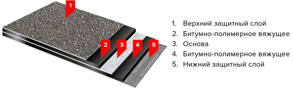 | ХКП | Стеклохолст + посыпка | Стеклохолст | Крупная посыпка | Плёнка | Внешний слой кровли |