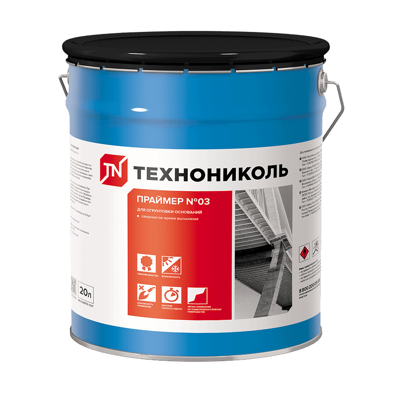Праймер битумно-полимерный ТЕХНОНИКОЛЬ № 03 представляет собой раствор нефтяного битума, полимеров и адгезионных добавок в органических растворителях.