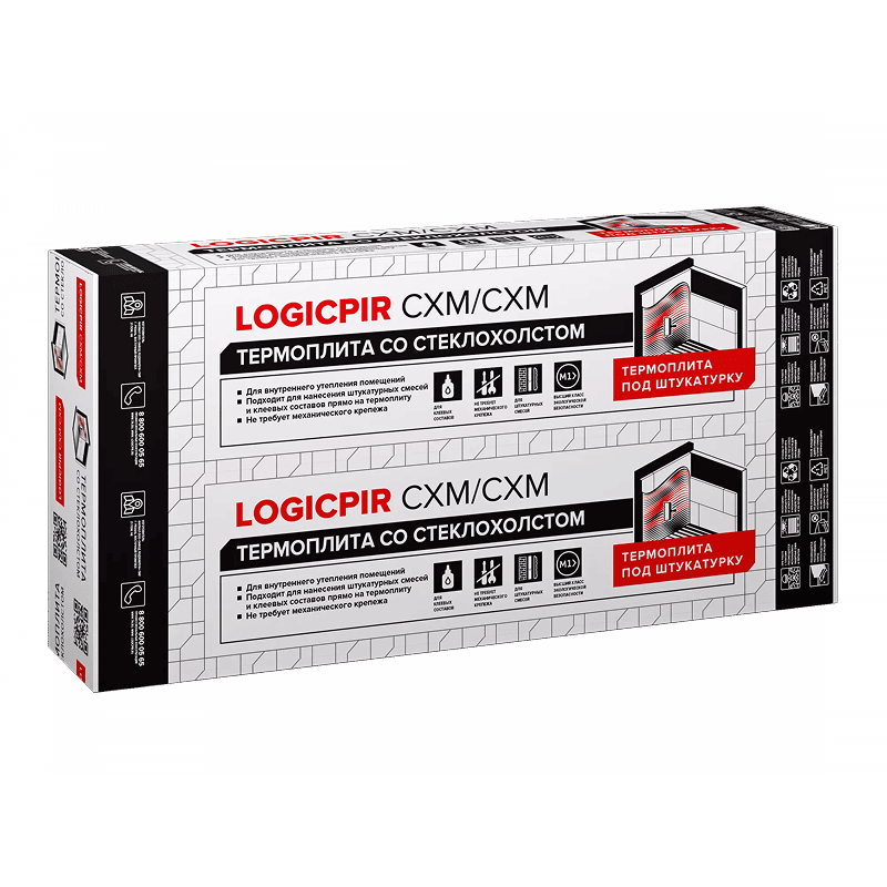 LOGICPIR СХМ/СХМ — жёсткие теплоизоляционные плиты с крайне низкой теплопроводностью, кашированные с обеих сторон стеклохолстом. Благодаря своему покрытию PIR-плиты имеют высокую прочность сцепления с клей-пеной (не менее 100 кПа). Поэтому они идеально подходят для использования в клеевых кровельных системах и для утепления стен с непосредственным нанесением штукатурки по плите.