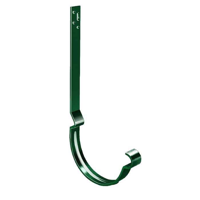 Служит для подвеса желоба на стропила, устанавливается до монтажа кровельного материала. Крюк длинный полоса производится из горячеоцинкованной стали толщиной 4 мм с последующим нанесением полимерного покрытия.