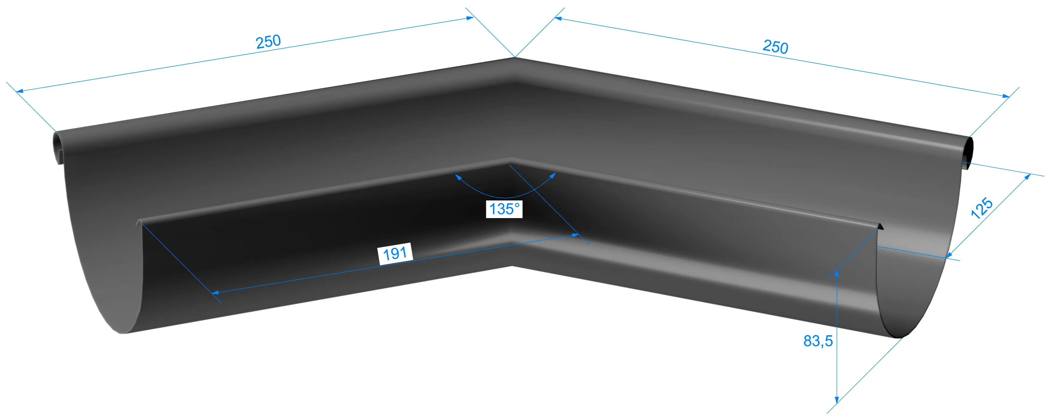 Устанавливается на внешних углах кровли и предназначен для соединения желобов под углом 135° в целях изменения направления движения воды.