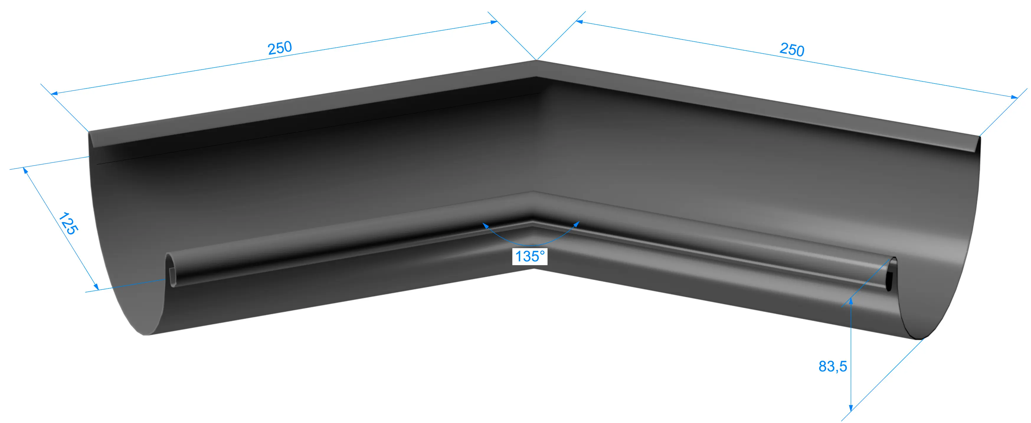 Устанавливается на внутренних углах кровли и предназначен для соединения желобов под углом 135° в целях изменения направления движения воды.