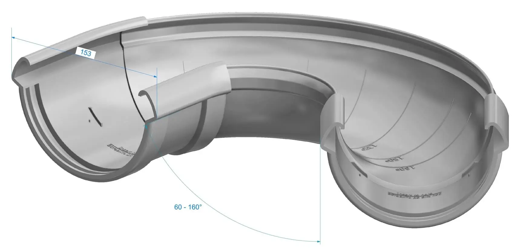 Регулируемый угол желоба предназначен для соединения водосточных элементов на кровлях с нестандартной геометрией. Благодаря возможности настройки, он позволяет стыковать желоба под любым углом в диапазоне от 60 до 160 градусов. Такая конструкция обеспечивает гибкость в проектировании и установке водосточной системы, позволяя эффективно отводить воду с крыш сложных форм, где стандартные углы недостаточны. Применение регулируемого соединительного элемента гарантирует надежность стыка и предотвращает протечки в местах изгиба или изменения направления водосточного желоба.